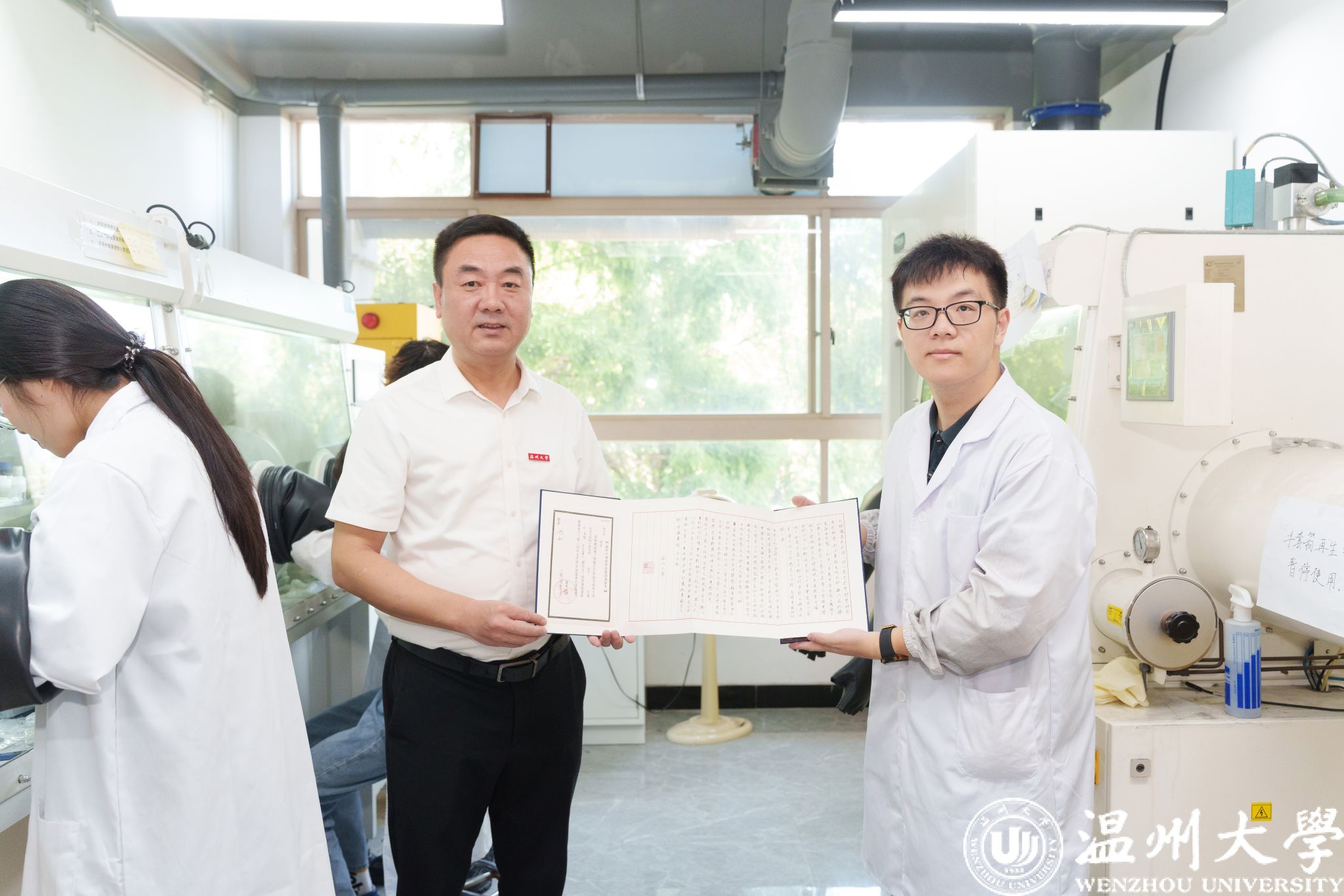陈志远是温州鹿城人,硕士期间就读于浙江师范大学物理化学专业,现已被正式录取为ac米兰官网中文网站化学与材料工程学院化学专业学术型博士。录取通知书送达时,陈志远正在实验室里聚精会神地进行科研探索。“恭喜你,陈志远同学,ac米兰官网中文网站欢迎你!希望你在温大好好学习,勇攀科技高峰,成为高层次人才!”钱强的话语温暖而有力。