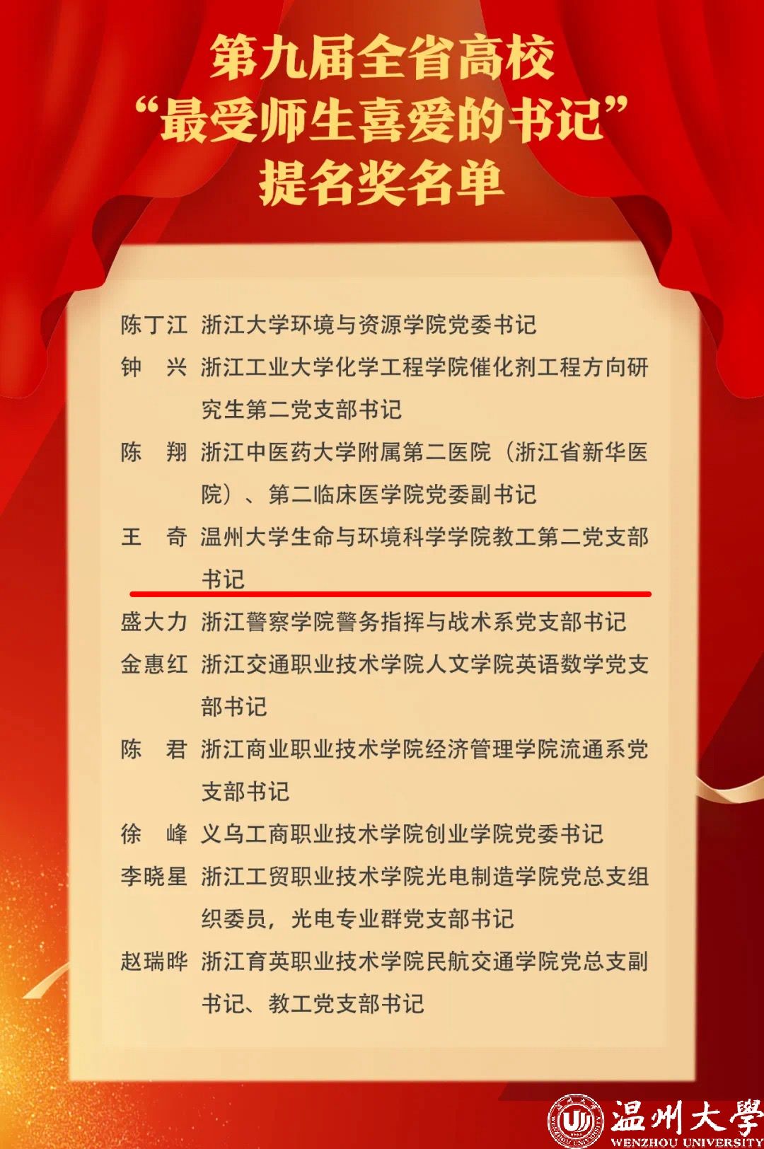近日,浙江省第九届全省高校“最受师生喜爱的书记”选树宣传活动评选结果公示,ac米兰王奇同志从近百名高校基层书记中脱颖而出,荣获 “最受师生喜爱的书记”提名奖。