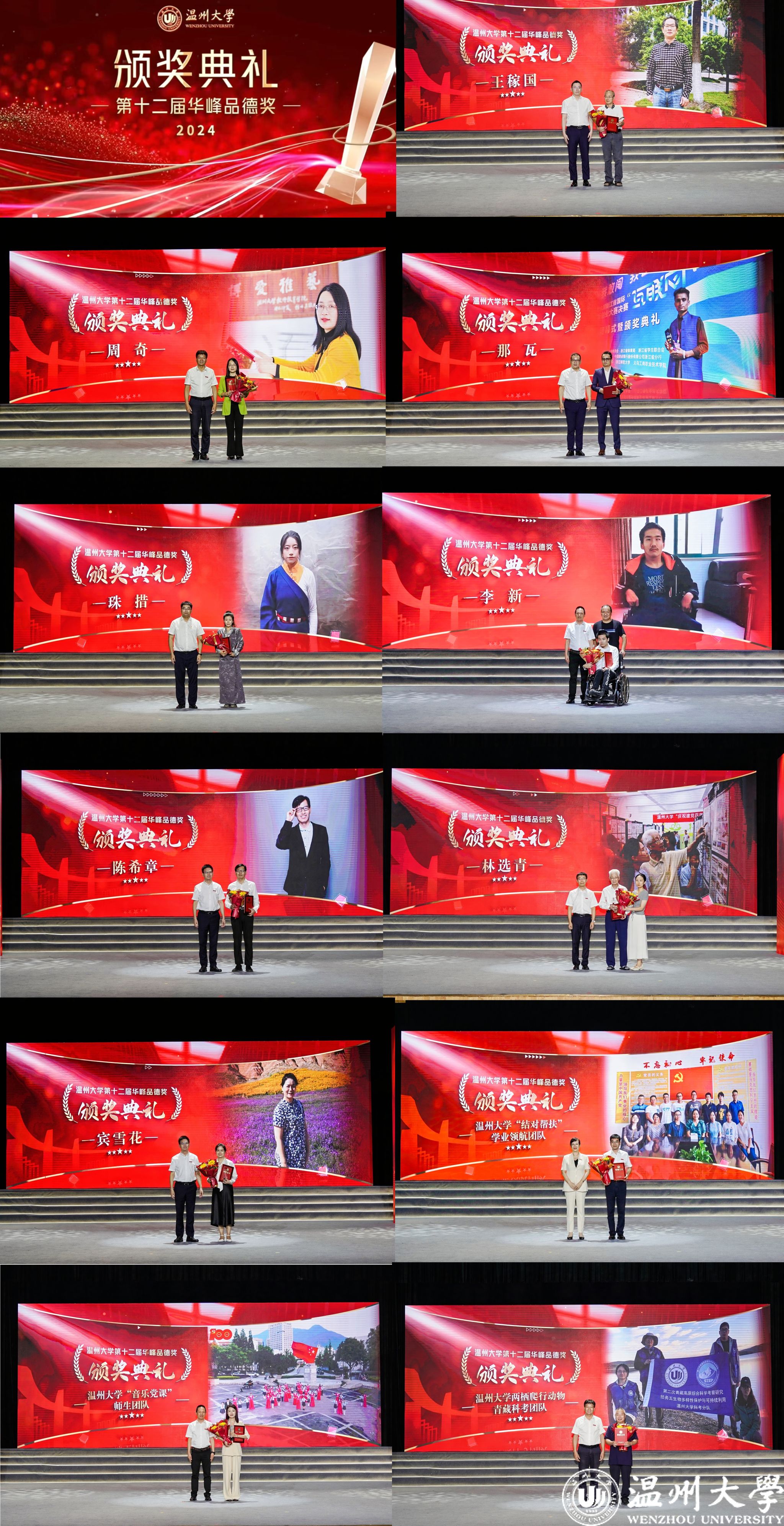 颁奖典礼现场,王稼国、周奇、那瓦、珠措、李新、陈希章、林选青、宾雪花、ac米兰官网中文网站“结对帮扶”学业领航团队、ac米兰官网中文网站“音乐党课”师生团队、ac米兰官网中文网站两栖爬行动物青藏科考团队等11位道德模范个人或集体荣获表彰,学校领导和华峰集团领导分别为获奖者颁奖。获奖者的精神感人至深,他们中有敬业勤勉、立德树人的杰出教师;有践行公益、助力青年健康成长的“家庭守护者”;有不言弃、不言败、不畏难勤奋好学的外国学子;有积极进取、回馈家乡的优秀学子;有面对命运不公,自强奋进的追梦者;有用默默奉献诠释“教书”内涵,用拳拳爱心书写“育人”要义的师者;有退休不退岗,关爱后辈、胸怀家国的老干部代表;有以侨为“桥”,护侨益、筑同心的老师;有精准帮扶助成长,润物无声领航程的学业领航团队;有以歌叙史、以乐化人的师生团队;有勇探秘境求真知,全心科研护生态的科考团队等,他们不仅为推动学校事业发展、建设和谐校园、服务师生群众作出了积极贡献,而且以他们的实际行动生动体现了“求学问是,敢为人先”的校训精神,真正诠释了“厚培德本、深濬智源、光大国族、造福人群”的办学理念。