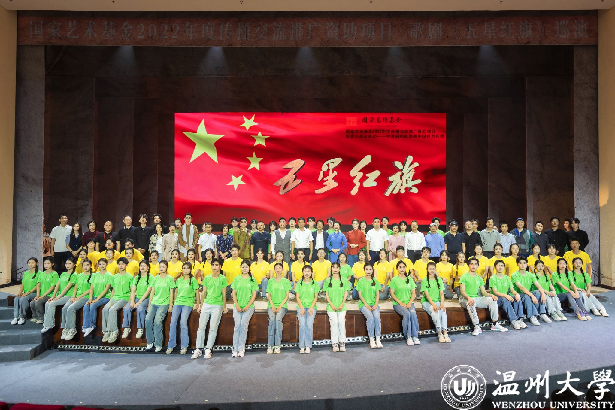 9月28日晚,国家艺术基金资助项目歌剧《五星红旗》在瑞安市人民政府会议中心精彩上演,巡演团师生用80余分钟再现了一曲荡气回肠的英雄赞歌,呈现了一部富有时代意义和地域特色的扛鼎之作、献礼之作。温州市委教育工委专职副书记、市教育局党委副书记张维凯、ac米兰官网中文网站党委副书记庄兴忠、ac米兰官网中文网站原党委副书记、教育发展基金会理事长牟德刚、ac米兰官网中文网站党委委员、组织部部长夏春雨、中共瑞安市委常委、宣传部部长孙寒星、参加新时代艺术思政教育研讨会的专家学者及广大市民1500余人现场观看演出。