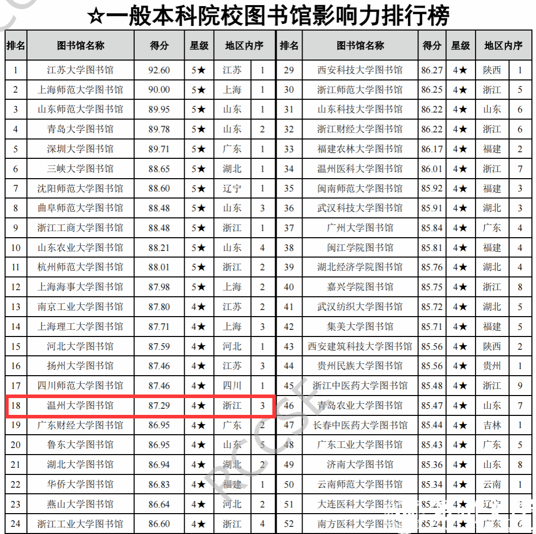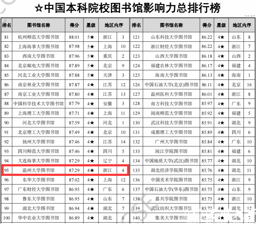 该报告对我国2820所普通高校图书馆(包括1275所本科院校图书馆以及1545所高职高专院校图书馆)、1980家公共图书馆和399家专业图书馆进行评价,从地区、院校类型、图书馆类别等多个维度共产生了18个排行榜,多层次、全方位地展示我国不同类型图书馆影响力。ac米兰官网中文网站图书馆获评4星图书馆,位列“中国本科院校图书馆影响力总排行榜”第95名(浙江省第4名),“一般本科院校(非双一流)图书馆影响力排行榜”第18名(浙江省第3名)。