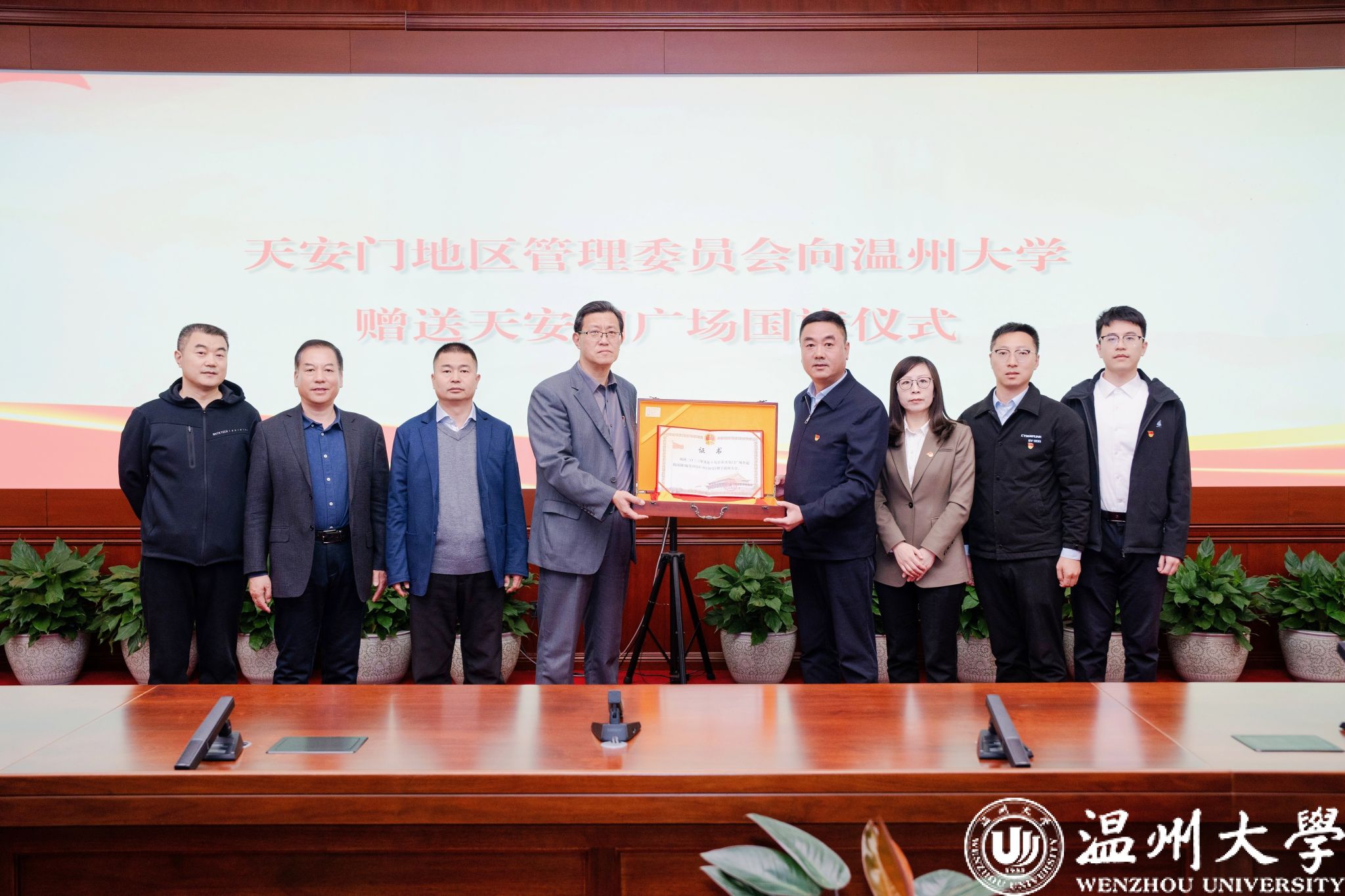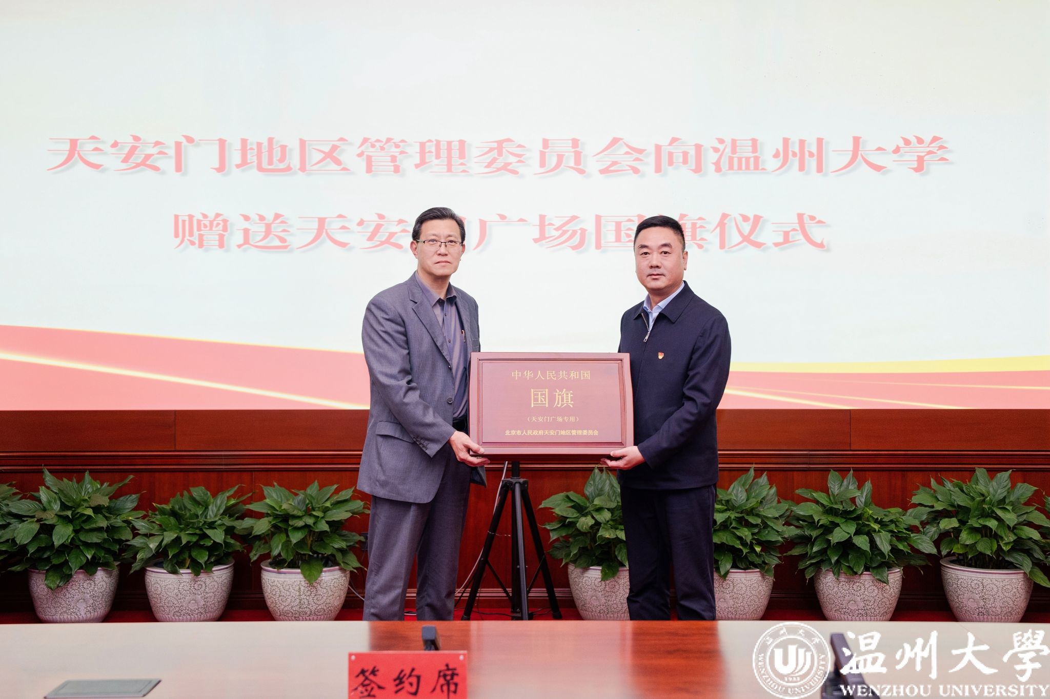 赠送仪式上,天安门地区管委会党组成员、副主任姚辉与钱强书记代表双方单位签订赠送协议,姚辉副主任向ac米兰官网中文网站赠送天安门广场国旗。