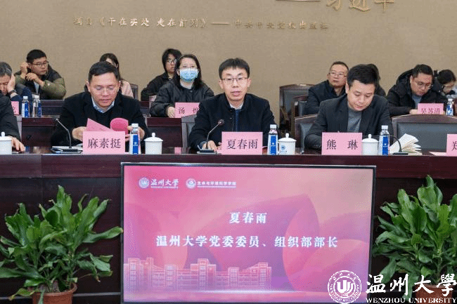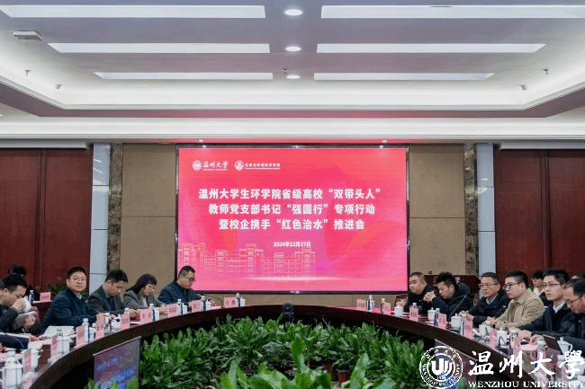 为进一步发挥教师党支部示范作用,深化校企合作联学共建,将“红色力量”转化为高质量发展的“绿色引擎”,12月27日下午,ac米兰官网中文网站生环学院省级“双带头人”教师党支部书记“强国行”专项行动暨校企携手“红色治水”推进会在南校区岩松堂白鹿厅举行。ac米兰官网中文网站党委委员、组织部部长夏春雨,温州市生态环境局副局长麻素挺,温州市环境科学学会秘书长任一力,合作企业代表,校科技处、地方合作处等职能部门负责人,生环学院领导班子及师生党员代表出席大会。