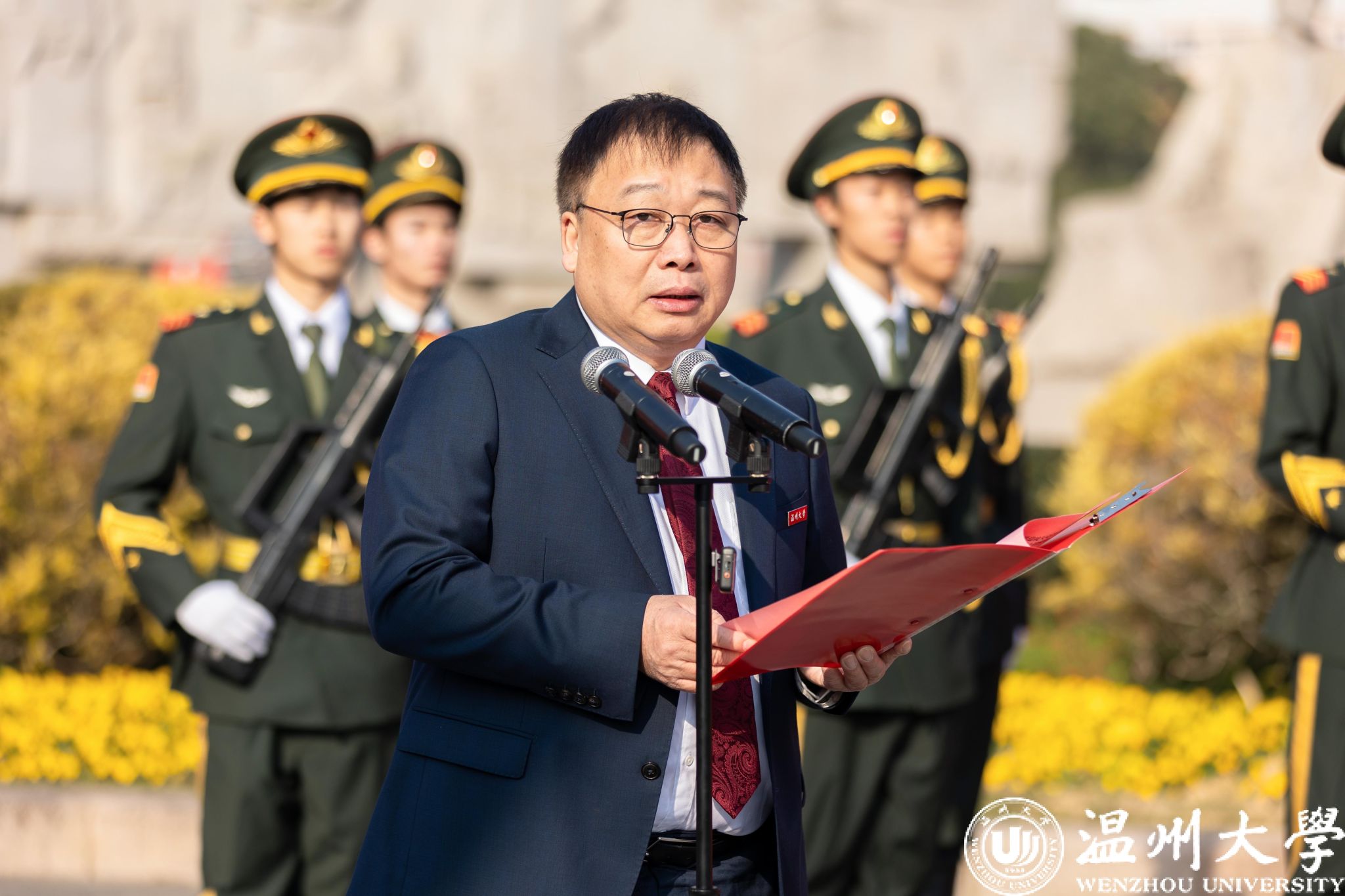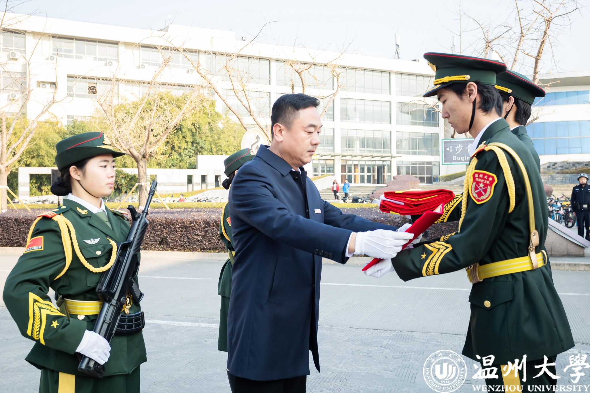在神圣而庄严的时刻,面对无比珍贵的五星红旗,ac米兰官网中文网站校长赵敏表示,获赠天安门广场国旗,是一份崇高的使命和无上的荣耀,呼应着ac米兰官网中文网站与祖国同心、与时代同行的辉煌历史,也将激励全体温大人为强国建设、民族复兴的历史伟业贡献力量。他寄语广大师生,要永葆赤子心,敬旗爱国、厚植家国情怀。充分利用学校国旗文化资源,进一步发扬爱国主义精神,增强国家意识和民族自豪感。要砥砺报国志,坚定理想、勇担复兴使命。锚定教育强国建设目标,将个人理想信念和价值追求融入党和国家事业之中,为实现中华民族伟大复兴而不懈奋斗。要实践强国行,立己达人、投身强国征程。时刻以国旗精神砥砺前行之路,为国家和区域经济社会发展、科技文化进步、人民生活幸福贡献“温大力量”。