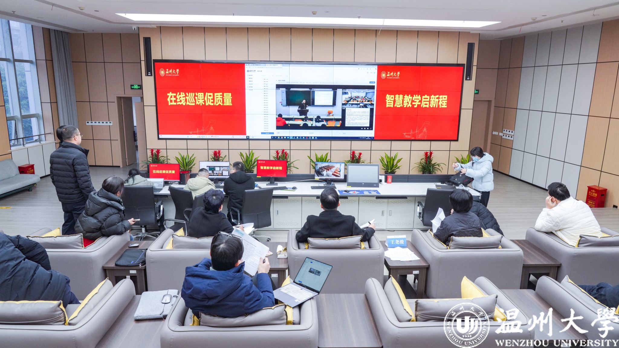 王尧骏一行于智慧校园展示中心通过“智慧教学管理平台”对全校教室进行线上全覆盖巡课,实时监控教学秩序与师生状态。教发中心和信息中心记录教学和设备异常情况,确保问题可追溯、整改有依据。随后,督导组分赴各学院开展线下听课,重点观察教学内容设计、师生互动及信息化手段应用情况。从检查情况看,整体教学秩序良好,师生精神面貌饱满,但在学习主动性和课堂互动活跃方面还有待提升。