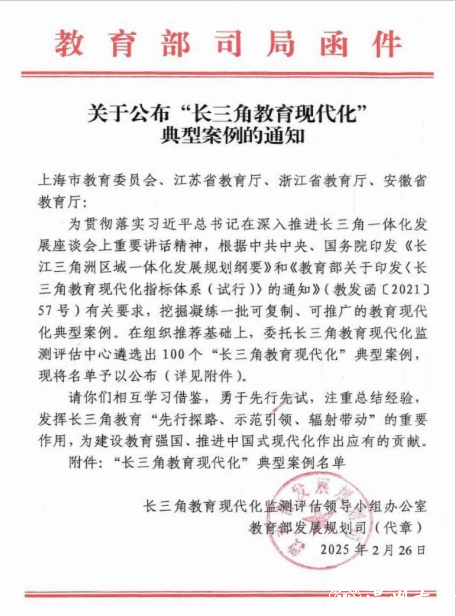 该案例征集通知由教育部发展规划司和长三角教育现代化监测评估领导小组办公室联合发布,旨在贯彻落实习近平总书记在深入推进长三角一体化发展座谈会上的重要讲话精神,推进中共中央、国务院《长江三角洲区域一体化发展规划纲要》和教育部《长三角教育现代化指标体系(试行)》(教发函[2021]57号)的深化实施。本次遴选面向长三角三省一市,共遴选出典型案例100个。