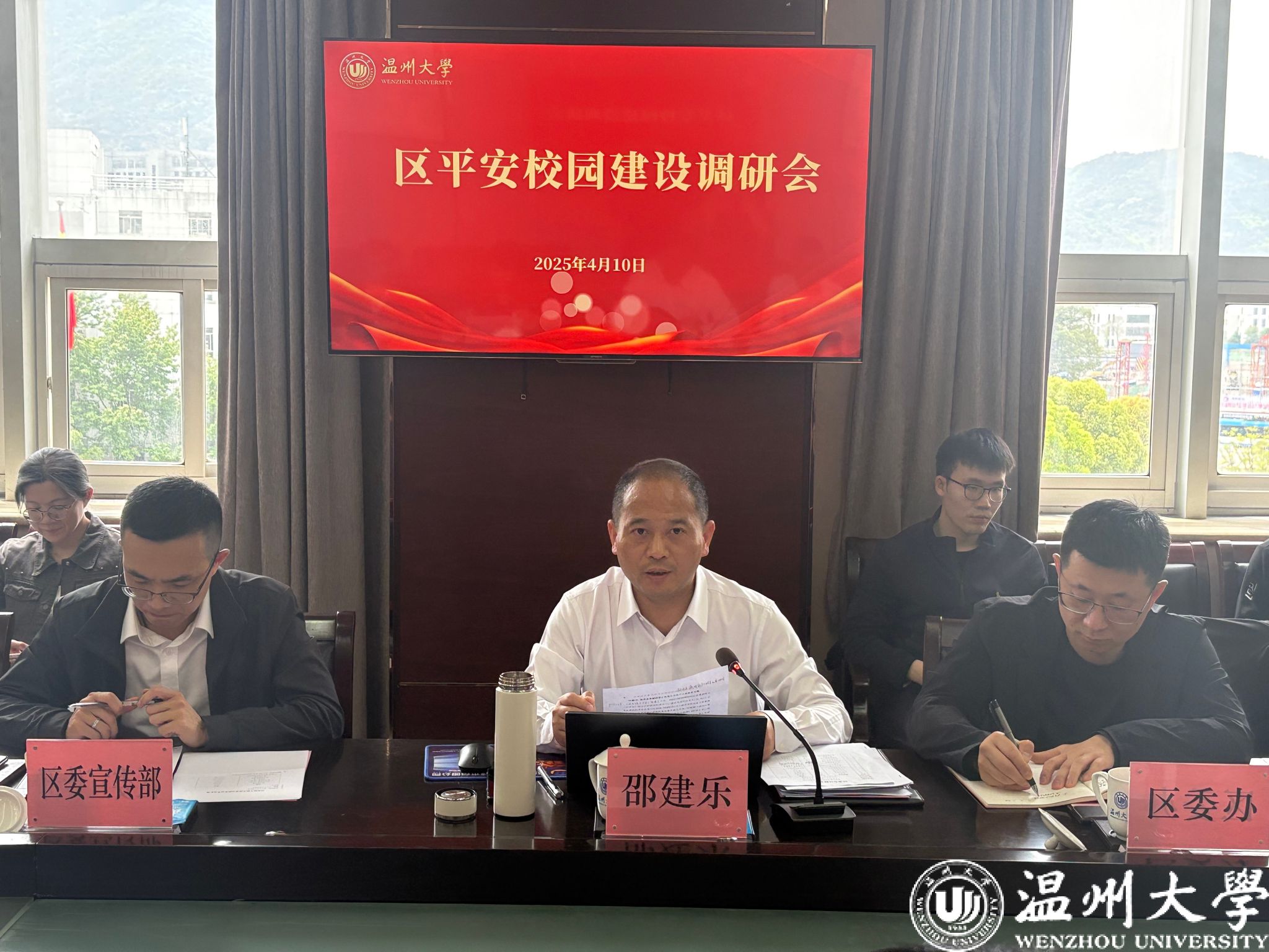 4月10日上午,瓯海区委副书记邵建乐一行来ac米兰专题调研平安校园建设工作。校党委副书记庄兴忠主持会议,党委委员、宣传部部长、统战部部长吴静,党校办、学工部、保卫部等相关部门负责人参会交流。