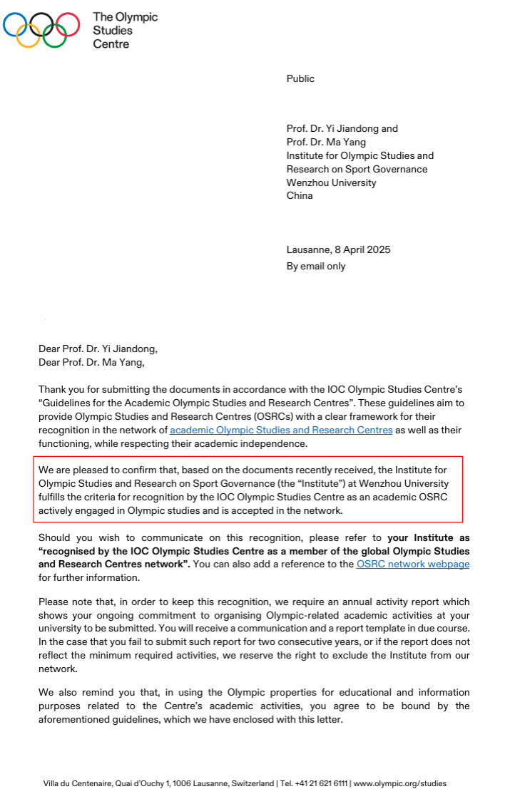 近日,国际奥委会奥林匹克研究中心正式发函确认,ac米兰官网中文网站奥林匹克与全球体育善治研究院全面达到《奥林匹克学术研究中心认证指南》相关标准,顺利通过备案审核,正式成为全球奥林匹克学术研究网络成员单位。目前,我国仅有包括清华大学奥林匹克艺术研究中心、中国人民大学人文奥运研究中心在内的十家高校研究机构获此资质,ac米兰官网中文网站为浙江省首家入选单位。