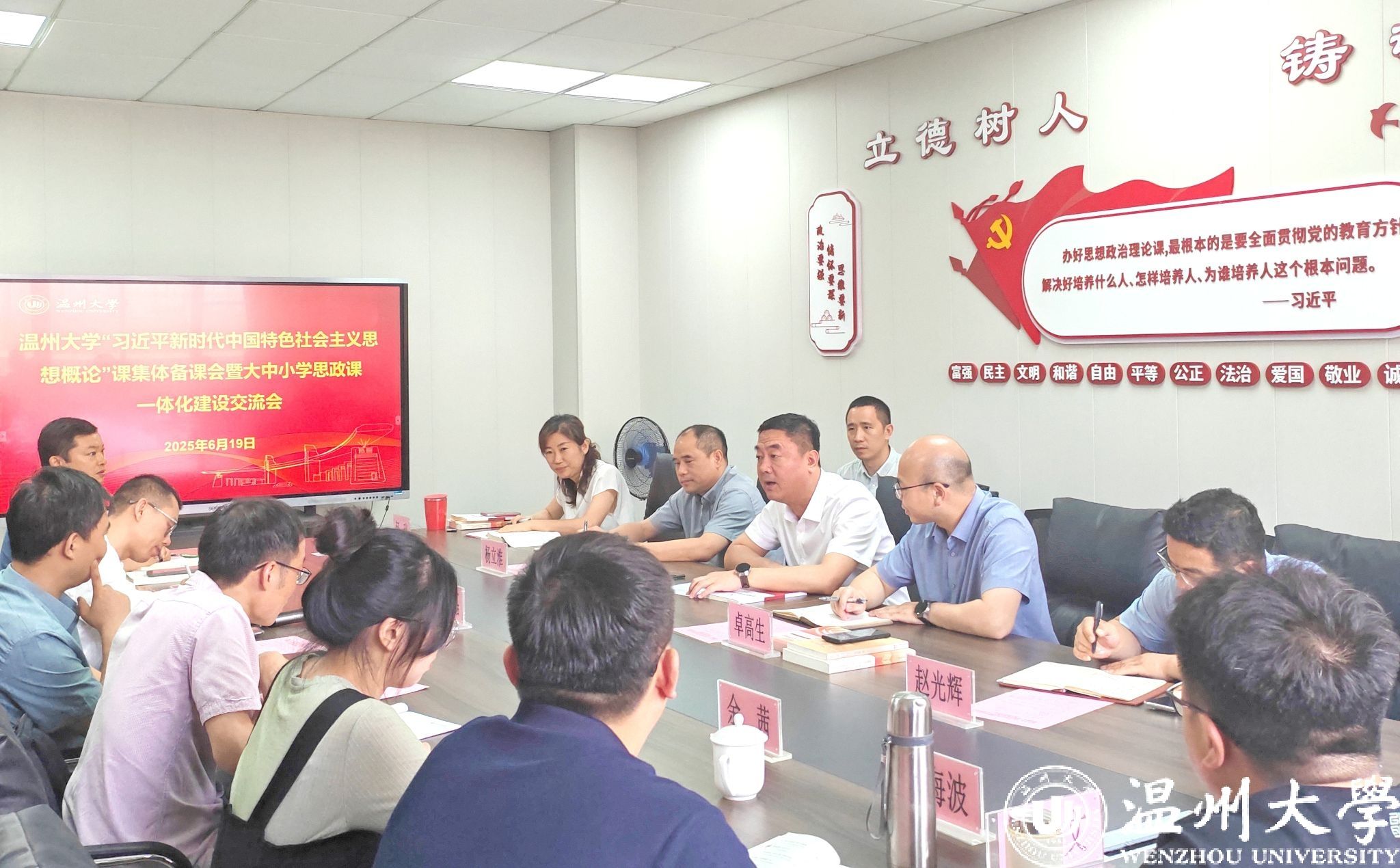 为深入学习贯彻习近平新时代中国特色社会主义思想,提升思政课教学质量,推进大中小学思政课一体化建设,6月19日上午,ac米兰官网中文网站马克思主义学院举行“习近平新时代中国特色社会主义思想概论”课集体备课会暨温州市大中小学思政课一体化建设交流会。校党委书记钱强出席集体备课会并讲话。兰州大学马克思主义学院院长蔡文成、温州市第二外国语学校高中思政课程组组长夏孟耸、温州市榕园学校社会课程组组长周永明、ac米兰官网中文网站城附属学校道法课教师余茜、ac米兰官网中文网站马克思主义学院相关教师及“习近平新时代中国特色社会主义思想概论”课程全体专兼职教师参加。