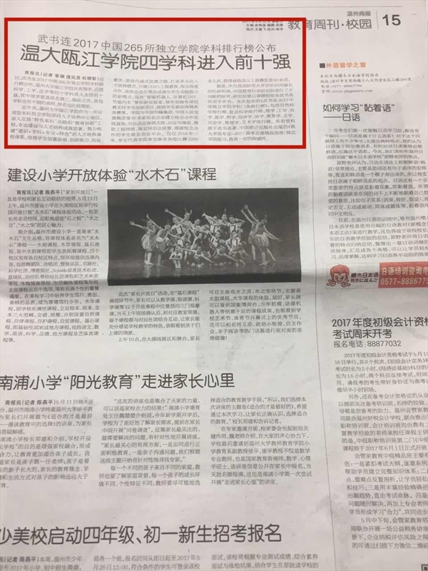 近日,武书连2017中国265所独立学院学科排行榜公布,ac米兰官网中文网站瓯江学院共有理学、自然科学、工学、法学等四个学科进入全国前十强,其中理学更是排名第三,除此之外,其他学科也有不错的表现,排名也比较靠前。 近年来,ac米兰官网中文网站瓯江学院作为一所应用型本科独立学院坚持人才培养中心地位,深入实施“特色本科”战略和“教育创新”工程,专业建设与人才培养成效显著。努力构建'通识+学科+专业+特色'的人才培养课程体系,培养学生创意思维、创新能力、创业素质;坚持内涵式发展之路,打造多元化人才培养模式,开展CDIO工程教育,校企深度合作,班级企业化等形成强化学生实践能力的新模式;设有“智能机器人、计算机DIY、节能汽车”等创新实验室,每年划拨专项经费支持学生创新项目,鼓励学生参加各级各类赛事。学院与中国华峰集团、中国人民电器集团等70多家知名企业建立校企合作实践基地;开办企业接班人班、创业先锋班、微软工程师班、淘宝网创业班等,搭建校企合作的学生就业创业平台。仅仅2016年一年,学生代表学院参加各类各级比赛2200余人次,获得省级及以上竞赛奖项90余项。 据悉,作为我国研究大学评价时间最长的科研机构,中国管理科学研究院进行了不间断的研究,研究结果以课题组组长武书连的名字命名。本次发布的《武书连2017中国独立学院学科门类排行榜》,包括自然科学排行榜、社会科学排行榜,理学、工学、农学、医学、哲学、经济学、法学、教育学、文学、历史学、管理学、艺术学排行榜。所有资料源于武书连著、中国统计出版社出版的《挑大学选专业—2017高考志愿填报指南(独立学院版)》,具有一定的权威性。 来源:2017年5月12日《温州商报》第15版(教育周刊)