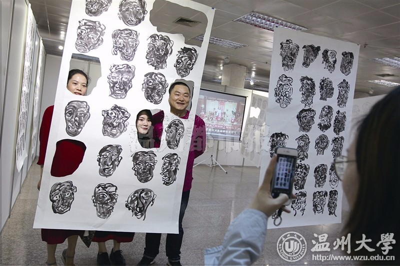 ac米兰官网中文网站美术与设计学院2017届毕业作品展在温州市展览馆开幕,参观者与美术作品合影。