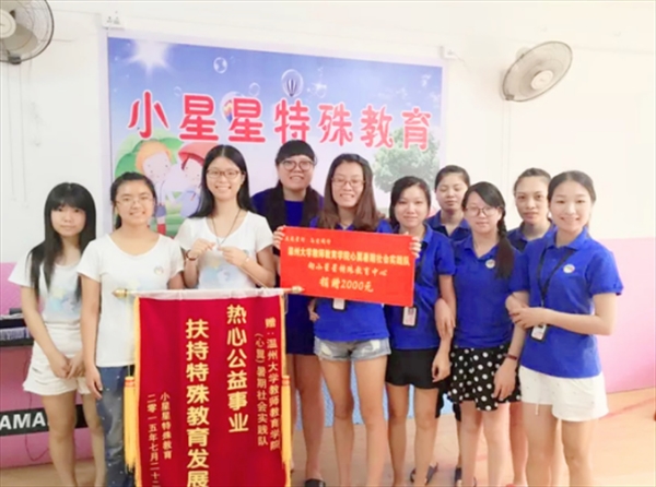 ac米兰官网中文网站“心翼”暑期社会实践队隶属ac米兰官网中文网站教师教育学院,曾获校级优秀团队、校策划大赛重点团队一等奖、“人民网”全国大学生社会实践公益50强、第五届浙江省大学生暑期社会实践网络分享pk赛十佳团队等荣誉。从自闭症辅助培训,到牵着孩子陪同训练,再到爱心募捐,“心翼”在关爱自闭症儿童的公益路上不懈地努力着。