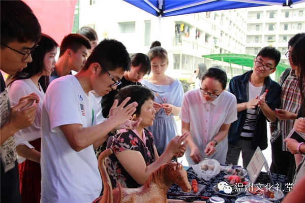 在活动现场上,既有以图文并茂的形式展示乐清市非遗保护成果的展板,也有非遗文化传承人带来的精美工艺实物展品,并进行现场的技艺展演。乐清细纹刻纸、黄杨木雕、竹壳雕、石雕、米塑、剪纸、象牙雕等一件件在我们看来不可能完成的作品,在这些传承艺人的手中却显得格外娴熟。窸窣窸窣,是传承艺人细纹刻纸时的细响;嘶嘶嘶嘶,是雕刻象牙时的声音;清脆的咔嚓声,是传统剪纸艺人的韵律,仿佛一场传统文化的交响曲,以不同的形式传递着传统文化的精华。同学们被这些乐清的非物质文化遗产所深深地吸引,好奇地询问着这些工艺大师们是如何做出这么精美的工艺品的,而他们也热情洋溢、不厌其烦地讲解着这些乐清独特的珍宝。透过这一件件奇秀灵动的非遗展品,投射出中华传统文化的独特魅力,链接艺术大师和温大学子们的互动与交流,传承着中华五千年文明的源远流长。