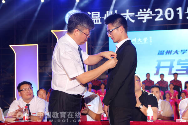校长为新生代表佩戴校徽