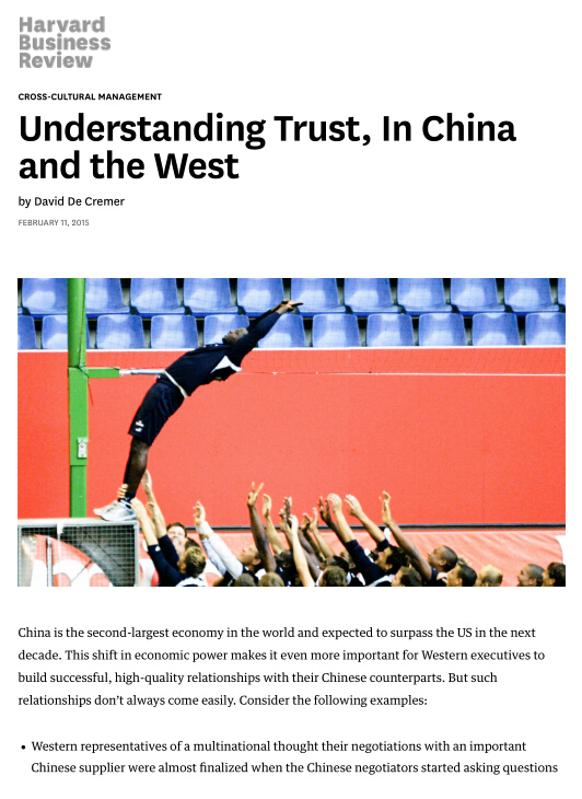 2015年2月11日,英国剑桥大学商学院教授、ac米兰官网中文网站国际合作学院客座教授David De Cremer,以ac米兰官网中文网站为第二作者单位在顶级期刊《哈佛商业评论》上发表文章《Understanding Trust, In China and the West》。