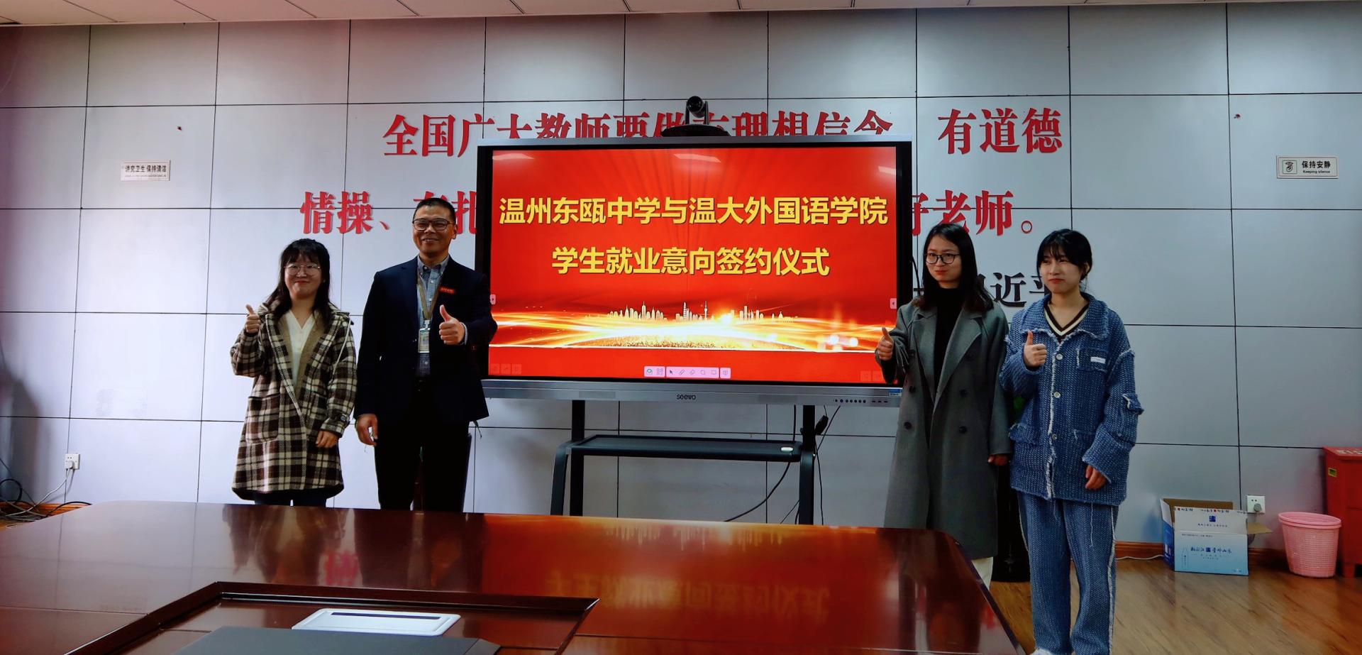 为进一步推进2023届高校毕业生春季促就业攻坚行动,助力毕业生高质量、精准就业,日前,ac米兰官网中文网站外国语学院院长叶苗带队走访温州东瓯中学,开展“访企拓岗促就业”活动,助力三名毕业生当场签订就业意向协议书。