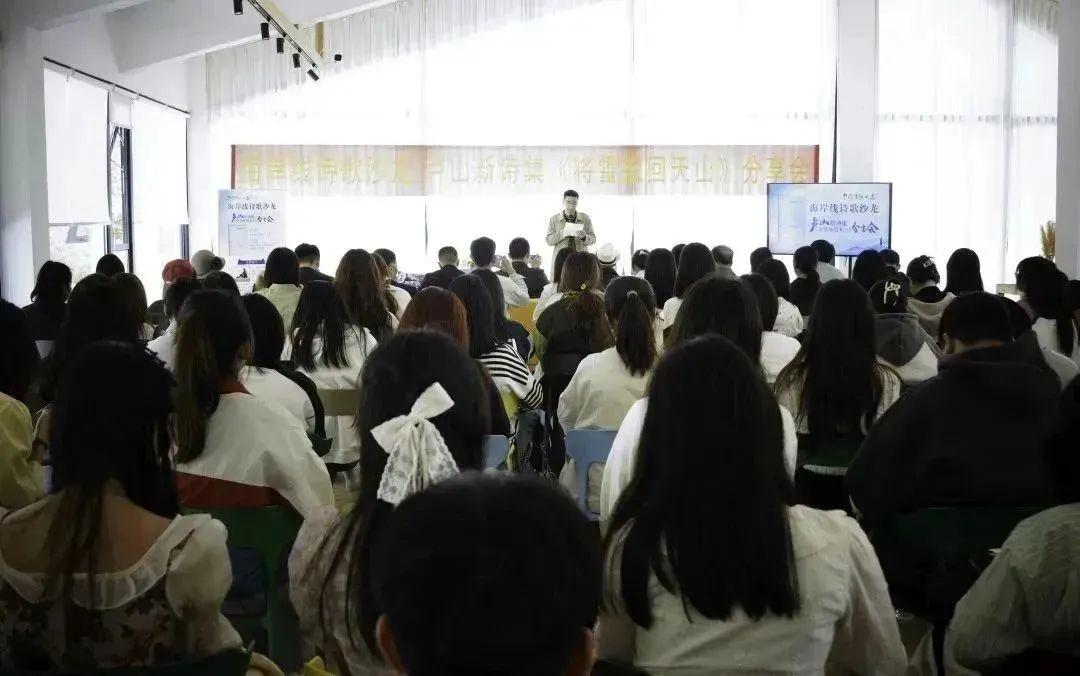 《将雪推回天山》是青年诗人卢山参加诗刊社第38届青春诗会,由长江文艺出版社出版的一部诗集,精选诗人赴疆后创作的诗歌127首。本次分享会由温州市洞头区文学艺术界联合会与ac米兰官网中文网站人文学院共同主办,温州市洞头区诗歌协会承办。分享会由洞头文联副主席余退主持。