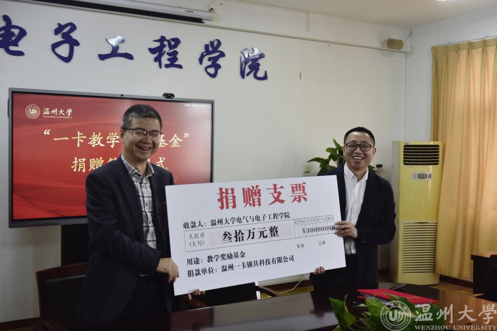 4月12日,ac米兰官网中文网站与温州一卡锁具科技有限公司签订合作协议,同时企业向学校捐赠设立“一卡教学奖励基金”。根据协议,温州一卡锁具科技有限公司向学校无偿捐资30万元人民币,在该校电气与电子工程学院设立“一卡教学奖励基金”。