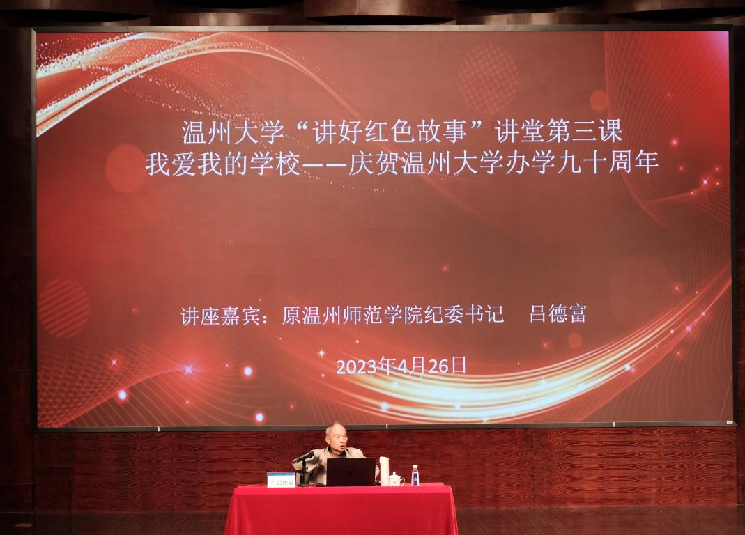 4月26日下午,为庆祝ac米兰官网中文网站办学九十周年、厚植青年学子爱国爱校情怀,ac米兰官网中文网站计算机与人工智能学院党委与ac米兰官网中文网站离退休党委联合举办的ac米兰官网中文网站“讲好红色故事”讲堂第三课在南校音乐厅顺利开课。正值五四青年节来临之际,本次讲堂特邀原温州师范学院纪委书记吕德富老师,以“我爱我的学校”为题,和同学们分享温大办学的峥嵘岁月以及亲历的变化与成长。