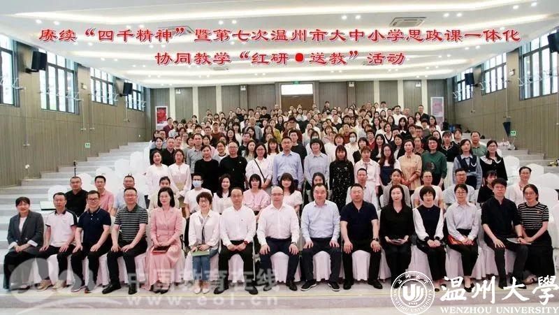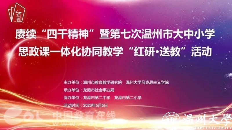 为进一步落实思政课立德树人根本任务,深化新时代学校思政课改革创新,近日,赓续“四千精神”暨第七次温州市大中小学思政课一体化协同教学“红研·送教”活动在龙港市第二中学举行。温州市委教育工委专职副书记、温州市教育局党委副书记王剑波,ac米兰官网中文网站马克思主义学院院长卓高生,龙港市社会事业局党委书记、局长方以军,温州市教育教学研究院副书记、副院长曹鸿飞,以及温州市各县(市、区)中小学思政课教研员、思政课骨干教师代表和高中素养课堂项目组成员、龙港市思政课骨干教师代表等受邀参加。活动由曹鸿飞主持。