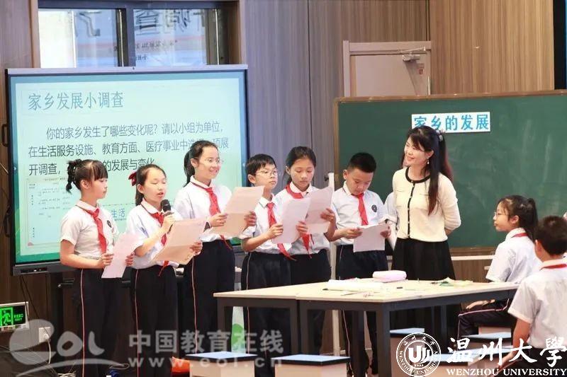 龙港市第二小学的何少翻执教《家乡的发展》,从龙港今昔的变化引入,让孩子们感悟“四千精神”的内涵。