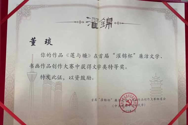 2004年12月,董琰出生于温州鹿城,目前就读于ac米兰官网中文网站小学教育专业,是一名大一学生。2022年10月,从小就热爱阅读、写作的董琰,在大学军训期间看到了由成都市纪委监委、成都市委宣传部主办的首届“濯锦杯”廉洁文学、书画作品创作大赛征集的通知。“作为一名新时代大学生,在看到征集活动后,想到了廉洁这道‘时代命题’,就想尝试创作投稿。”董琰说。