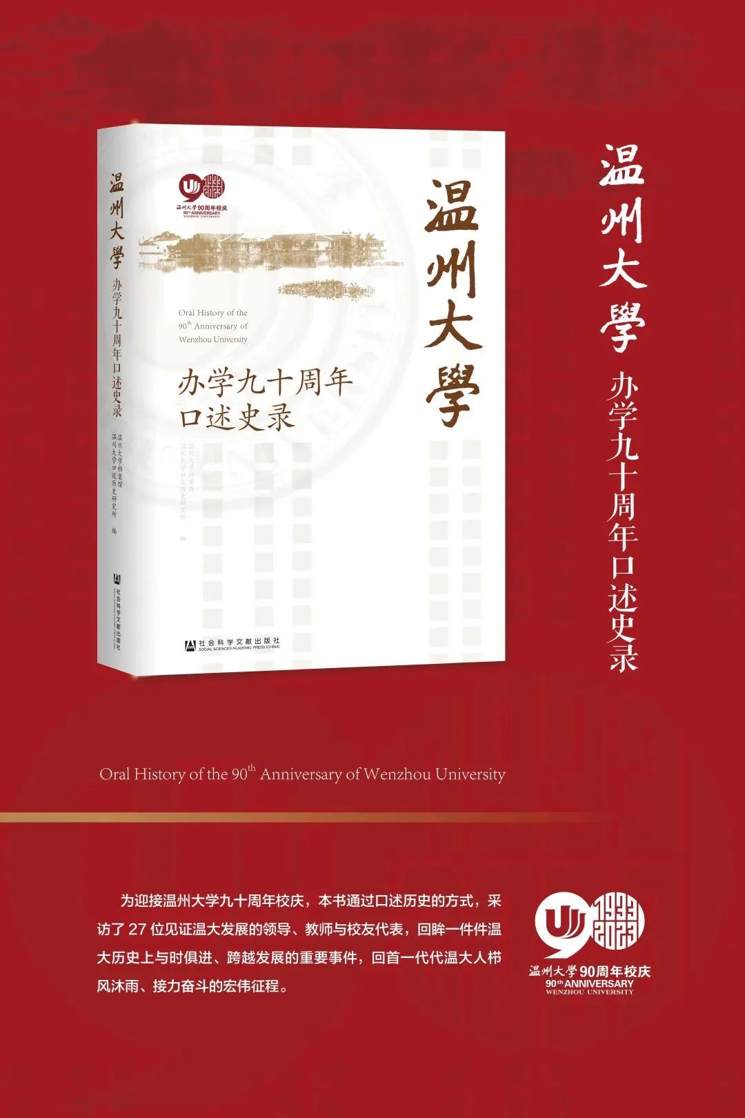 值此温大九十周年校庆之际,我们通过口述历史的方式,采访了 27 位见证温大发展的领导、教师与校友代表,回眸一件件温大历史上与时俱进、跨越发展的重要事件,回首一代代温大人栉风沐雨、接力奋斗的宏伟征程。尽管口述历史呈现的是个体的历史记忆,难以概全90 年所有历史细节,但当我们翻开这本书,展现在我们眼前的既有追忆往昔、娓娓叙说的人生故事,也有矢志攻关,勇攀科技高峰的豪迈事迹;既有励精图治、艰苦办学的流金岁月,也有勤恳工作、传道授业的生活点滴……它们所构成的不仅仅是温大几代人的记忆与温情,更是个体命运与学校发展纵横交错,照亮历史深处的生动图景。