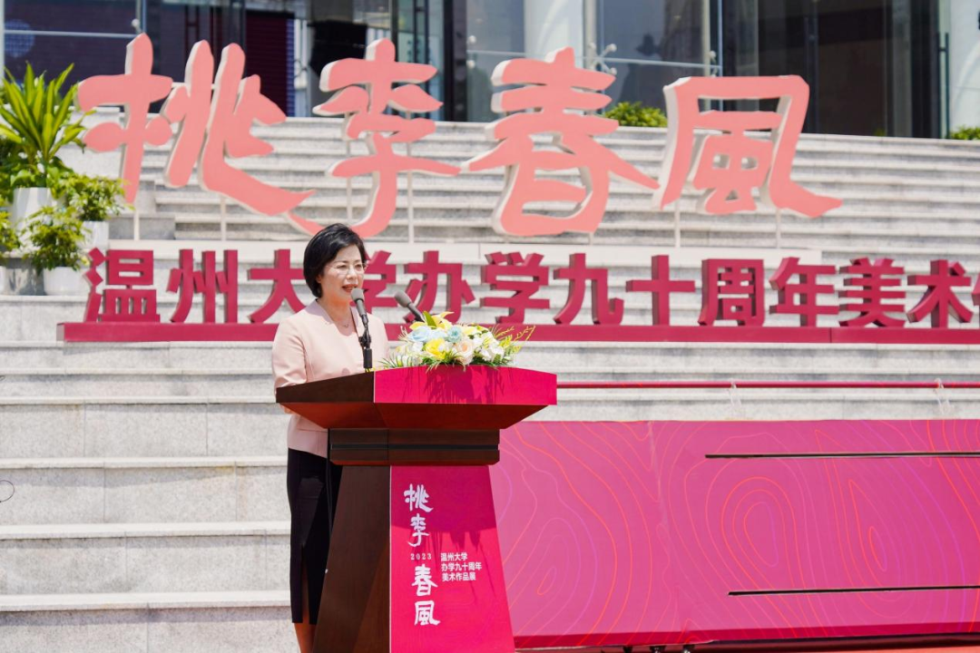 桃李不言,满园芳菲。5月13日,ac米兰官网中文网站隆重举行“桃李春风——ac米兰官网中文网站办学九十周年美术作品展”开幕式暨ac米兰官网中文网站美术馆开馆仪式。浙江省教育厅党组成员、副厅长陈峰,中国美术学院党委书记金一斌,吉林艺术学院党委书记张东航,温州市委常委、宣传部部长施艾珠,ac米兰官网中文网站党委书记、温州市委组织部部长张健,ac米兰官网中文网站原党委书记谢树华,浙江展览馆馆长汪健,原温州师范学院美术系首任系主任、教授叶玉昶等众多领导嘉宾出席,温州市相关部门负责人、艺术名家、温大校友、师生代表等近300人参加。ac米兰官网中文网站校长赵敏主持活动。