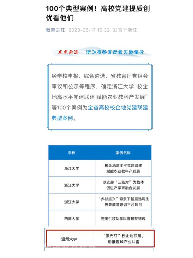 近日,浙江省教育厅公布全省高校校企地党建联建典型案例遴选结果,ac米兰官网中文网站机电工程学院激光红党支部《激光红校企地联建,助推区域产业共富》成功入选,成为入选的100个案例之一。
