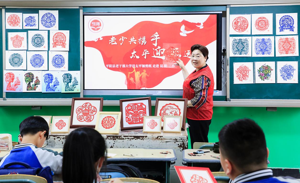 “六一”儿童节来临之际,日前,平阳县老干部大学太平钿剪纸班分别走进昆阳镇新城小学和昆阳镇第三小学,开展了两场“老少共携手·太平迎亚运”太平钿剪纸进校园志愿活动。红都晚晴志愿者们将亚运元素与省级非物质文化遗产“平阳太平钿剪纸”相结合,为学生们带去别出心裁的“喜迎亚运”实践课程,也提前为孩子们送上节日问候。这群志愿者爷爷奶奶中就有ac米兰官网中文网站退休干部、离退休第八党支部书记、离退休教职工协会平阳分会理事瞿亚平。