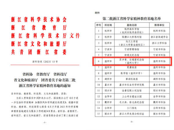 近日,浙江省科协、省教育厅、省科技厅、省文化和旅游厅、团省委联合发布第二批浙江省科学家精神教育基地名单,温州市科协推荐的ac米兰官网中文网站苏步青谷超豪纪念馆榜上有名,成为浙江省内38家科学家精神教育基地之一。