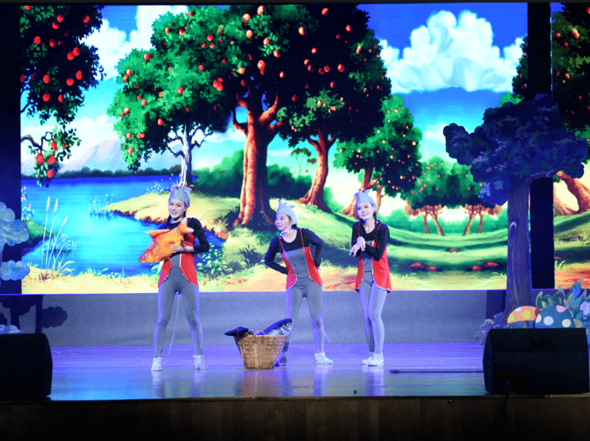 教育学院学前教育专业的同学们,发挥专业技能和教育素养,用丰富的表情与灵活的肢体动作,生动演绎了跌宕起伏的故事情节。舞台上,美轮美奂的光影和悦耳动听的旋律,时不时博得现场观众的阵阵掌声。