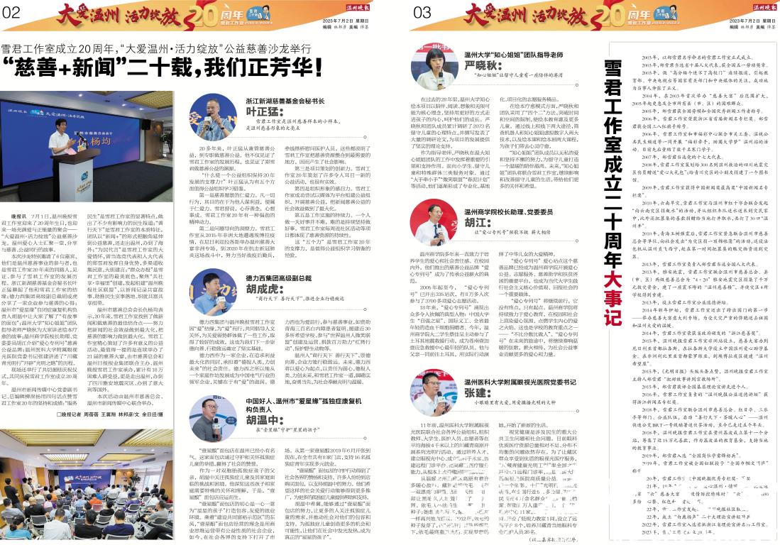 如今的温州擦亮了“大爱城市、诚信社会、道德高地”品牌,描绘了一幅“全域共建、全民共享”的美好新场景。借此雪君工作室20周年来临之际,温州晚报开展“大爱温州· 活力绽放”系列报道,用新闻笔力讲述温州这座大爱之城的公益慈善故事,展现温州在“续写创新史、走好共富路”过程中的公益慈善力量。