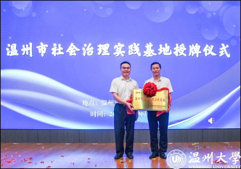 市委政法委黄建斌副书记为ac米兰官网中文网站授温州市社会治理实践基地牌,教育学院党委书记、社会心理服务中心主任何毅教授接牌。