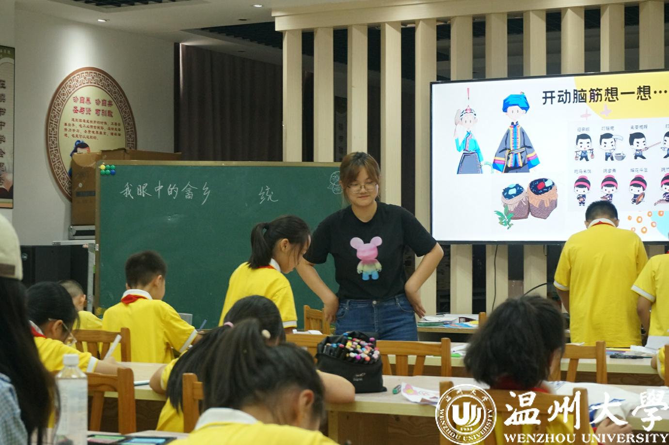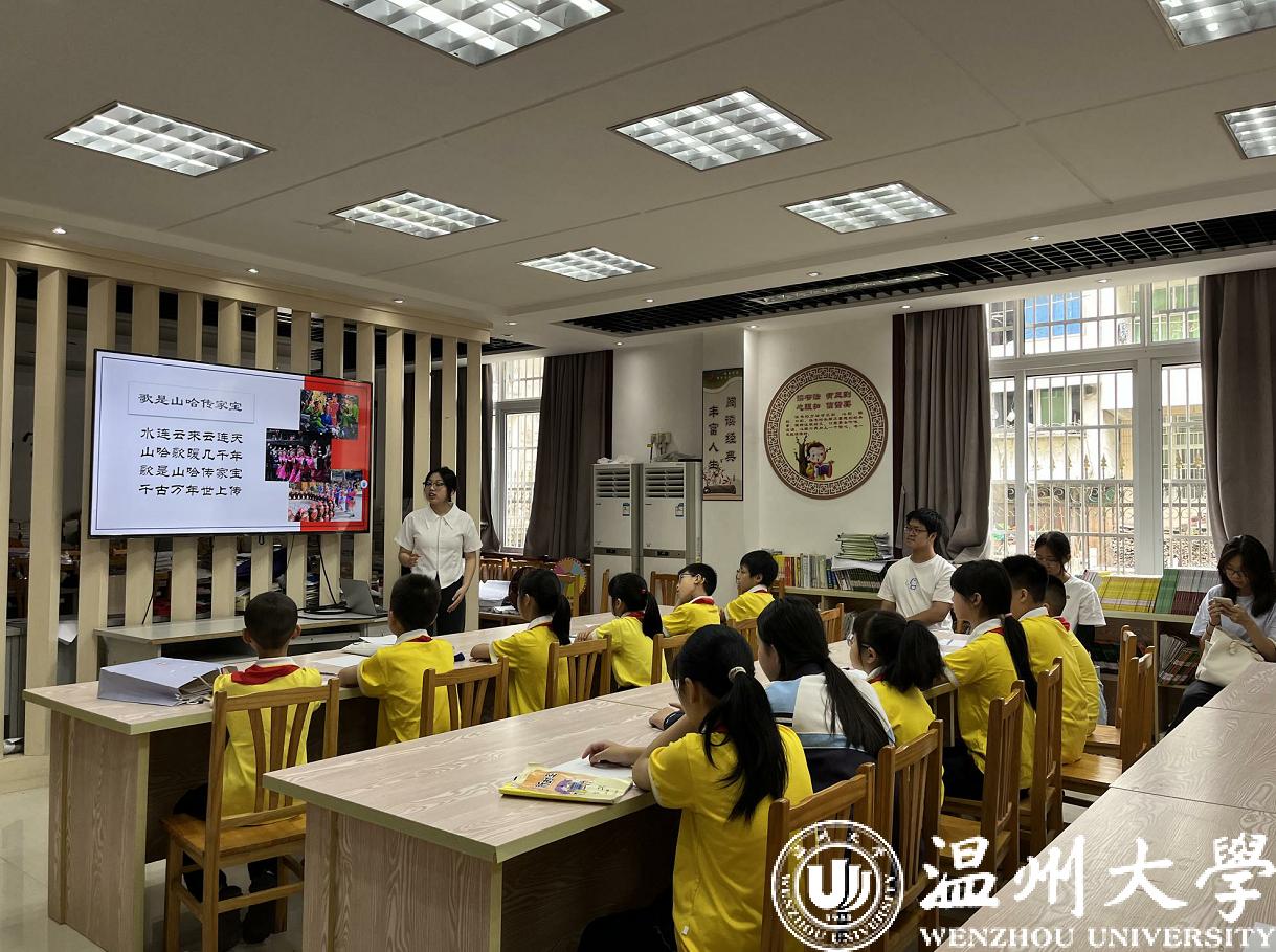 为推动畲族文化传承和发展,实践队针对当地情况,设计了教畲语、画畲服的专项课堂。来自畲族的主讲员蓝栀烨从最简单常用的畲族日常用语入手,就畲语的基本特点、基本发音、会话及畲歌的基本知识、对歌要领等内容对孩子们进行讲解。蓝栀烨同学对小朋友们说:“我们畲族没有文字,畲歌都是靠口口相传的形式一辈一辈地传下来的,希望能够通过教大家唱畲语畲歌,让畲族文化更好地传递下去。”