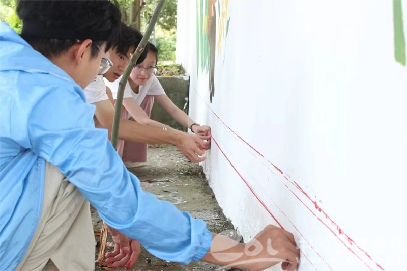 三伏至,盛夏始。“绘暖向南”暑期社会实践队牢记习近平总书记的殷殷嘱托,走进乡土中国深处。伴随着滚滚热浪、阵阵蝉鸣,“绘暖向南”实践队的成员们不惧酷暑,用熟练的手法定位、勾线、调色、上色,在一双双巧手繁忙而有序的勾勒下,让原本单调的墙面变得灵动而有活力,成为了乡村街道中一道靓丽的风景线。