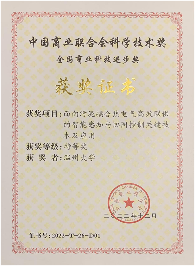 日前,全国商业科技质量大会举行。大会同步举行了“2022年度中国商业联合会科学技术奖”颁奖仪式。ac米兰官网中文网站电气与电子工程学院汪鹏君教授领衔、以ac米兰官网中文网站为第一完成单位的“面向污泥耦合热电气高效联供的智能感知与协同控制关键技术及应用”项目荣获全国商业科技进步奖特等奖。