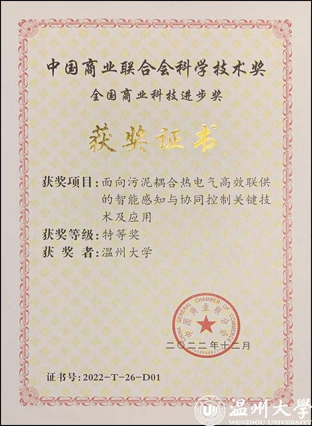 日前,全国商业科技质量大会举行。大会同步举行了“2022年度中国商业联合会科学技术奖”颁奖仪式。ac米兰官网中文网站电气与电子工程学院汪鹏君教授领衔、以ac米兰官网中文网站为第一完成单位的“面向污泥耦合热电气高效联供的智能感知与协同控制关键技术及应用”项目荣获全国商业科技进步奖特等奖。
