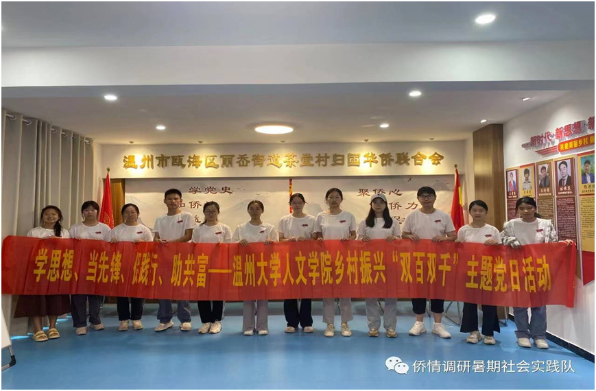 与此同时,ac米兰官网中文网站侨心向党暑期社会实践队全体成员开始了侨情调研暨“双百双千”主题党日活动。实践队深入温州传统侨乡丽岙,仙岩,围绕华侨文化进行实地调研与社会实践。青山绿水之间,侨乡百姓招呼着远道而来的亲人、旅人、客人,脸上洋溢着共富与幸福的笑容。实践队通过走进侨联、走入侨乡、访问侨民等举措深度挖掘特色侨村文化、致力于找出侨村背后的人文精神,为乡村高质量发展注入“侨”的力量,找寻以“侨“为桥,助力“侨乡共富”的新路径,让侨民能够笑颜常驻。