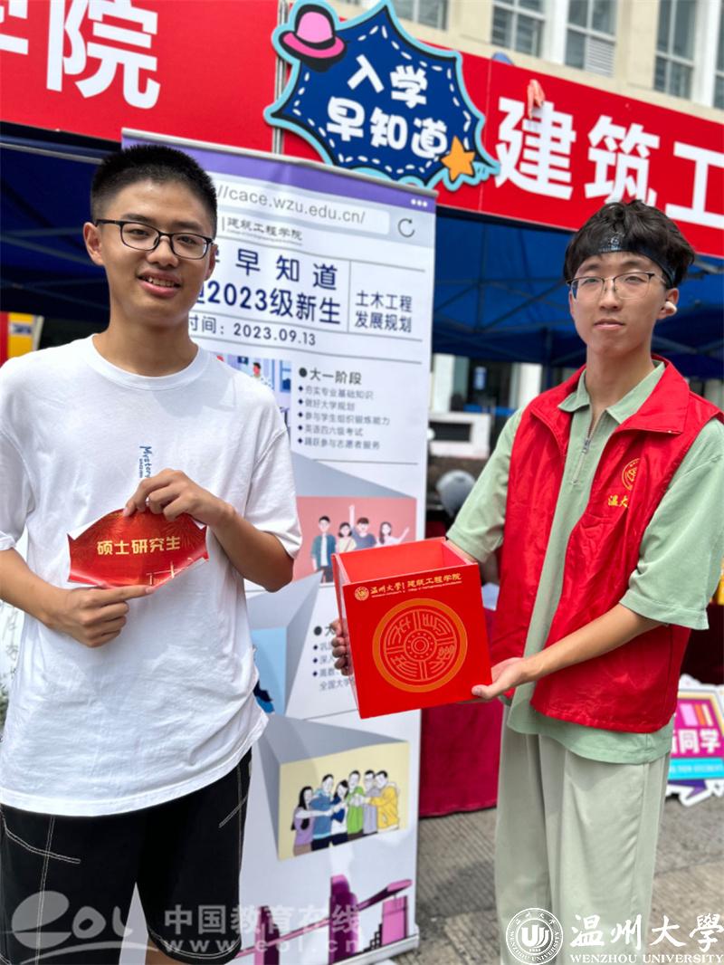 在迎新现场,建筑工程学院接待点“入学早知道”展板特别吸眼球,新生们纷纷驻足观看大学四年(五年)学业规划秘籍,并好奇地拆开毕业时自己的盲盒,然后迫不及待地寻找规划锦囊,领取1000页的“红方砖”记事贴。
