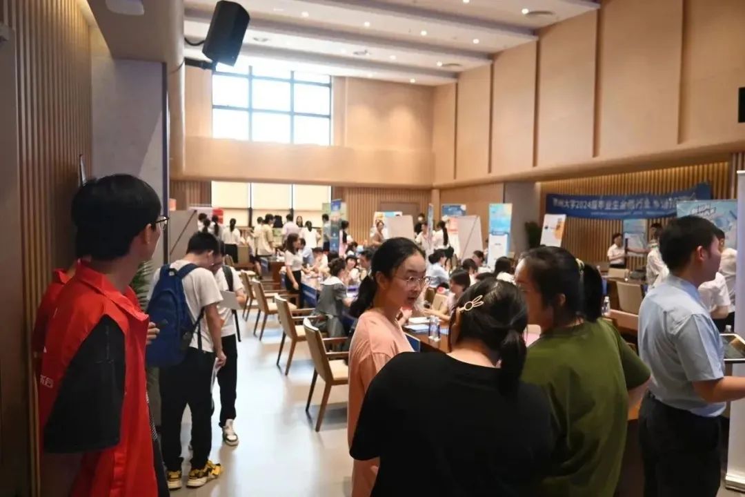 招聘会现场气氛热烈,参会单位通过宣传册、一对一交流等形式向同学们细致介绍单位情况、薪资待遇、职位晋升、行业前景与人才需求。同学们积极与招聘人员交流,主动向心仪的用人单位了解相关情况并现场投递简历。