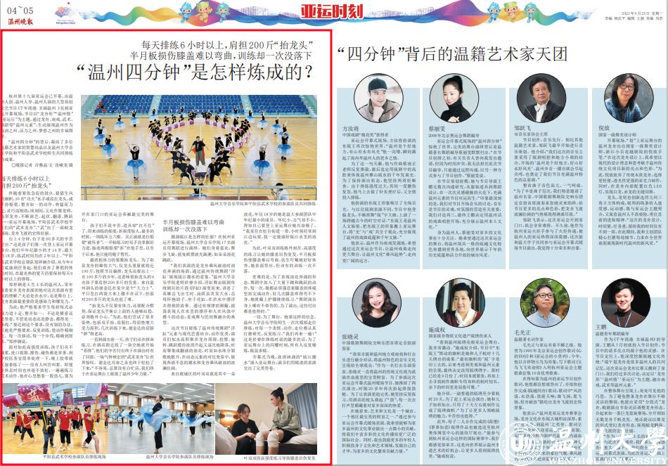 一直到演出前一天,孩子们还在拼命 练习,在酒店附近找了一块空地就开始 “彩排”,他们的辛苦付出终于在演出时有 了回报,一场气势恢宏的“武术龙舟”让世 界惊叹。谢金达兴奋之余也终于轻松了 下来:“不容易,总算没有白忙活,我们终 于在亚运舞台上展现了温州少年力量。”