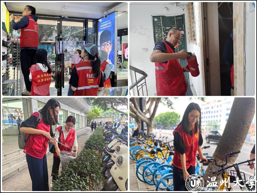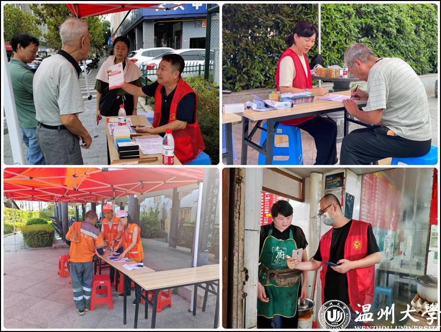 机关党委党员干部分20个批次深入一线与社群支部党员、工作人员并肩作战,弹好“调查、宣讲、走访”三部曲,织密“平安温州”防护网。一是走上街头普及安全知识。通过发放问卷形式,开展群众安全感调查,宣讲食品药品安全、用电用火用气安全,引导居民积极举报犯罪线索,崇尚科学防范邪教,提高警惕防范诈骗,拒绝毒品珍爱生命。动员辖区居民签订消防安全责任书,落实安全责任制。二是挨家挨户排查安全隐患。上门走访居民检查瓶装燃气、减压阀、胶管、用汽环境、灶具、电瓶车等使用情况,筑牢社区安全屏障,用心守护居民安全。三是深入街区助力环境整治。围绕“文明城市、幸福温州”建设重点,对蒲鞋市社区周边的主干道及地下通道进行卫生整治、垃圾分类,对路面通道进行标识检查,规范车辆停靠,劝导无序人员不文明行为,以“微改造”带动“精提升”,助力提升行人的体验感和舒适感。四是深入群众开展“志愿浙江”推广行动。通过街头驻点形式,一对一指导居民使用小程序宣传“志愿浙江”平台,倡导人人参与志愿服务,推进志愿服务常态化开展和数智化推广,争取实现15分钟志愿服务圈,凝聚社区工作人员、居民党员、退役军人、医护工作者等各方力量,把服务延伸到居民家中,助力打造“志愿温州”。