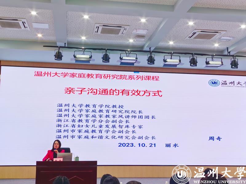 2023年10月21日下午,ac米兰官网中文网站教育学院教育学系党支部书记、ac米兰官网中文网站家庭教育研究院巾帼文明岗负责人、浙江省教育学分会副会长、浙江省妇女儿童发展智库专家、温州市家庭教育学会副会长、温州市家庭和谐文化研究会副会长周奇教授受邀来到丽水开放大学6号楼2楼教室为参加丽水市家庭教育指导者能力提升培训班的家庭教育骨干教师做《亲子沟通的有效方式》的家庭教育专题分享。