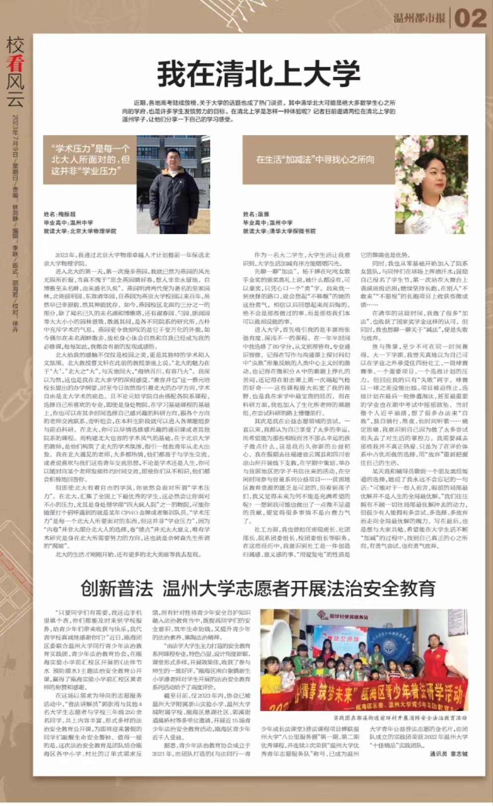 在这场以需求为导向的志愿服务活动中,“普法讲解员”郭张雨与其他4名大学生志愿者与学校三年级250余名同学,共上内容丰富、形式多样的法治安全教育公开课,为即将迎来暑假的同学们敲醒生命安全警钟。值得一提的是,这次法治安全教育是团队结合瓯海区各中小学、村社的订单式需求反馈,而有针对性将青少年安全自护知识融入法治教育当中,既提高同学们的安全意识、筑牢生命防线,又提升青少年的法治素养、熏陶法治精神。