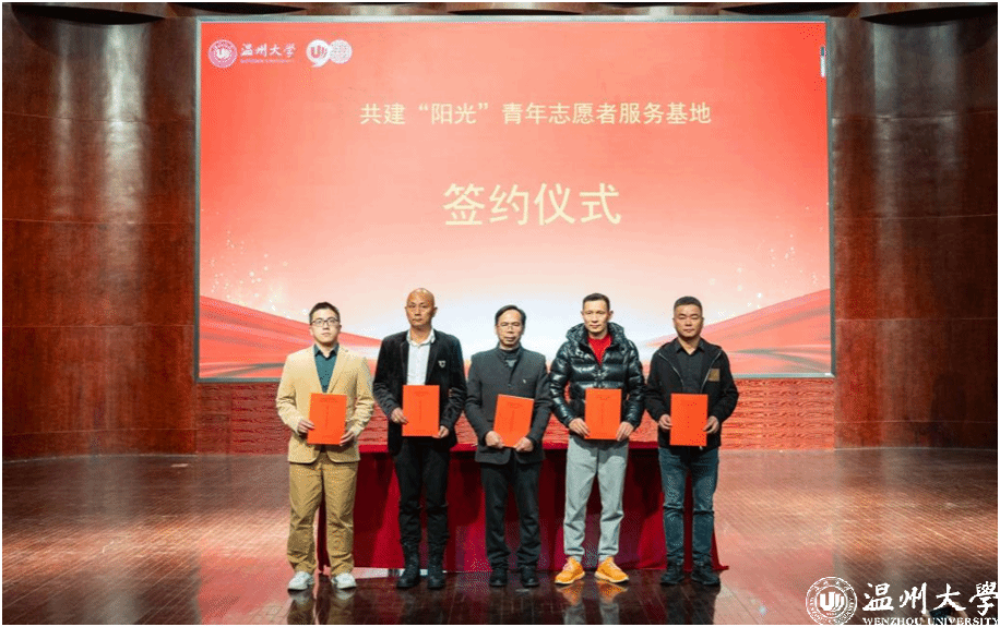 会上,“阳光”志愿服务团队指导师、浙江省“双带头人”教师党支部书记何明昌教授,代表ac米兰官网中文网站数理学院与瓯海茶山街道山根社区、丽岙侨心养老院、康居乐养老院、温州福寿康公司签署共建“阳光”青年志愿者服务基地协议书。数理学院副院长蔡风景为上述四家服务单位授牌。章志图为数学、物理、统计、信算等四个专业的“阳光”志愿者分队授旗。师生通过敲鼓的形式共同启动“阳光”敬老服务月活动。