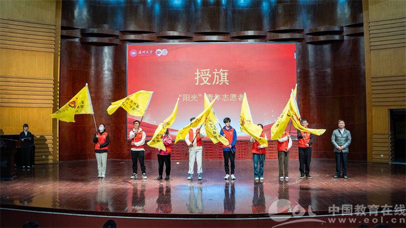会上,“阳光”志愿服务团队指导师、浙江省“双带头人”教师党支部书记何明昌教授,代表ac米兰官网中文网站数理学院与瓯海茶山街道山根社区、丽岙侨心养老院、康居乐养老院、温州福寿康公司签署共建“阳光”青年志愿者服务基地协议书。数理学院副院长蔡风景为上述四家服务单位授牌。章志图为数学、物理、统计、信算等四个专业的“阳光”志愿者分队授旗。师生通过敲鼓的形式共同启动“阳光”敬老服务月活动。