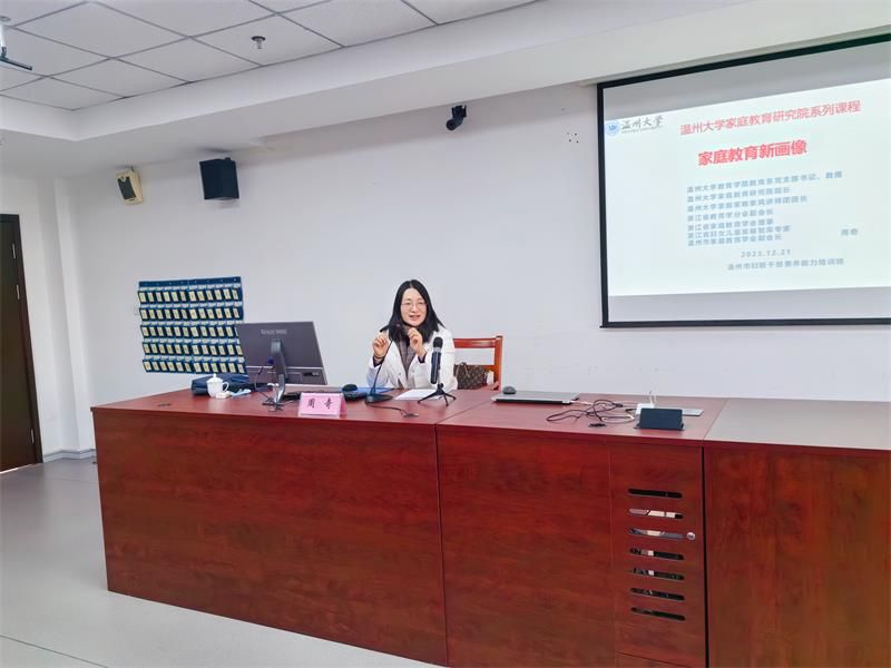 2023年12月21日,ac米兰官网中文网站教育学院教育学系党支部书记、ac米兰官网中文网站家庭教育研究院巾帼文明岗负责人、ac米兰官网中文网站家庭家教家风讲师团团长、浙江省教育学分会副会长、浙江省家庭教育讲师团成员、浙江省妇女儿童发展智库专家、温州市家庭教育学会副会长、温州市家庭和谐文化研究会副会长周奇教授受邀来到温州市妇联干部素质能力培训班,以线下形式为妇联干部做《家庭教育新画像》家庭教育专题分享。