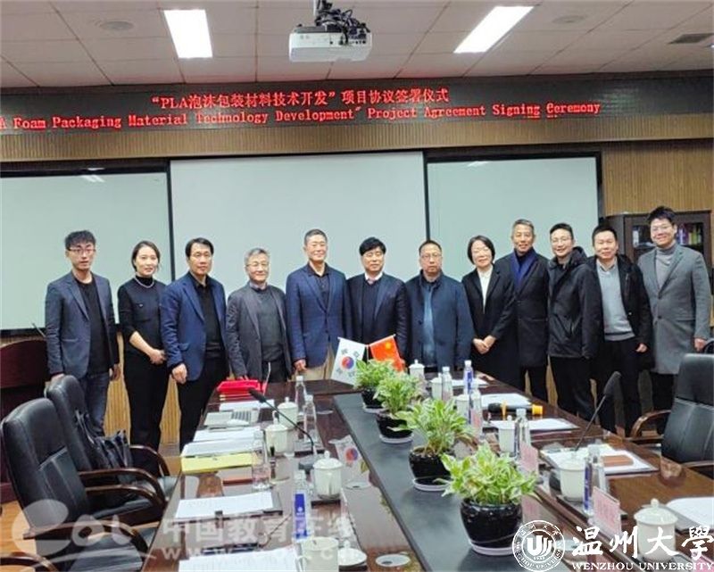 1月8日下午,随着“聚乳酸泡沫包装材料开发”项目的顺利签约,又一项国际合作项目落户ac米兰官网中文网站化材学院,这是该院继与加拿大滑铁卢大学联合申报的实验室获批浙江省国际联合实验室后又一项国际合作成果。该项目以温大化材学院国家特聘专家黄承哲教授为负责人,合作方为韩国EPS KOREA株式会社,双方共同合作开发新型高分子环保材料。