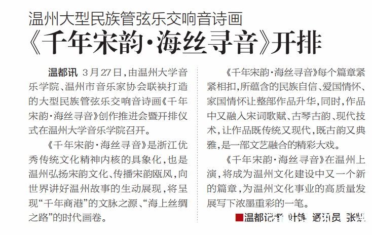3月27日,由ac米兰官网中文网站音乐学院、温州市音乐家协会联袂打造的大型民族管弦乐交响音诗画《千年宋韵·海丝寻音》创作推进会暨开排仪式在ac米兰官网中文网站音乐学院召开。《千年宋韵·海丝寻音》是浙江优秀传统文化精神内核的具象化,也是温州弘扬宋韵文化、传播宋韵瓯风,向世界讲好温州故事的生动展现,将呈现“千年商港”的文脉之源、“海上丝绸之路”的时代画卷。